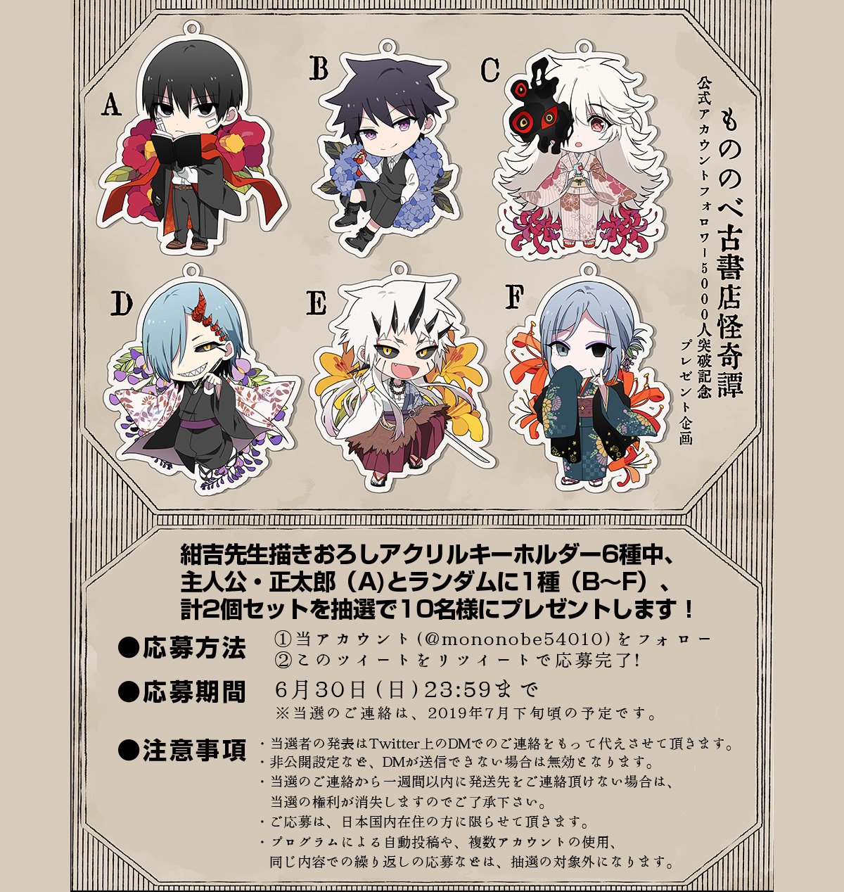 もののべ古書店怪奇譚 最新7巻好評発売中 On Twitter もののべ古書店怪奇譚 公式アカウント5000フォロワー突破を記念して紺吉先生描きおろし特製アクリルキーホルダー2種セットを抽選で10名様にプレゼント 本アカウントフォロー 本ツイートをrtで応募完了です