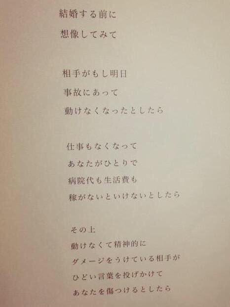 Ya様 على تويتر 結婚するということ 全ての考えが正しいとは 限らんけど もしこの内容が 好きな人と重なったとき 心から言えるんかな 私がこの立場になったら 無言で抱きつくだろうな 伝え方が違っても 傍にいたいって気持ちが あれば十分だよねっ