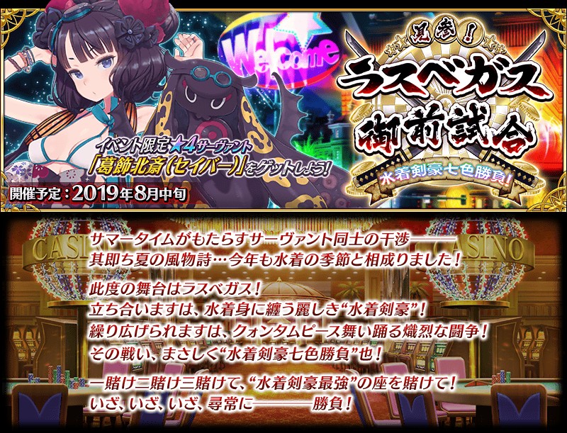 Fate Grand Order 4 Sr 葛飾北斎 セイバー が登場 期間限定イベント 見参 ラスベガス御前試合 水着剣豪七色勝負 8月中旬より開催決定 Boom App Games